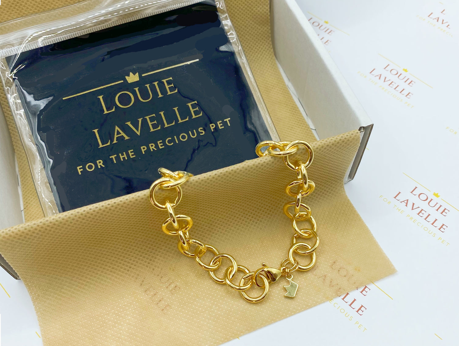 LOUIE LAVELLE chain is meant to last for the lifetime of your pet. Just wipe and store. Maintenance made simple.